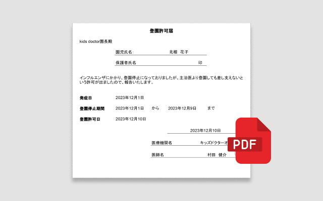 園や学校に提出する登園許可証や意見証の発行が可能です。指定のフォーマットがあればそちらにも対応します。PDFデータでお渡ししますので、必要に応じてご自宅やコンビニなどで印刷してご活用ください。