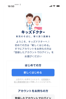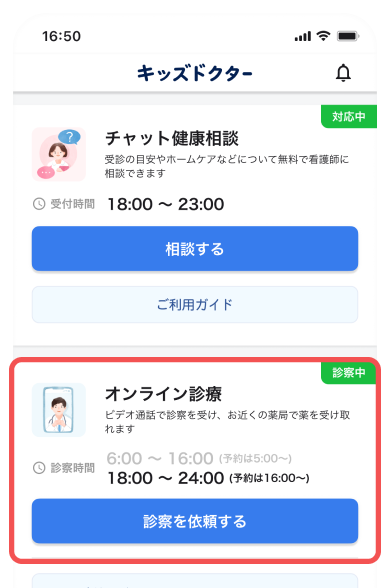 キッズドクターアプリのホーム画面から「オンライン診療」を選択し、問診票に回答して診察を依頼してください。オペレーターが問診票を確認し、アプリ内のチャットからご連絡いたしますので、しばらくお待ちください。